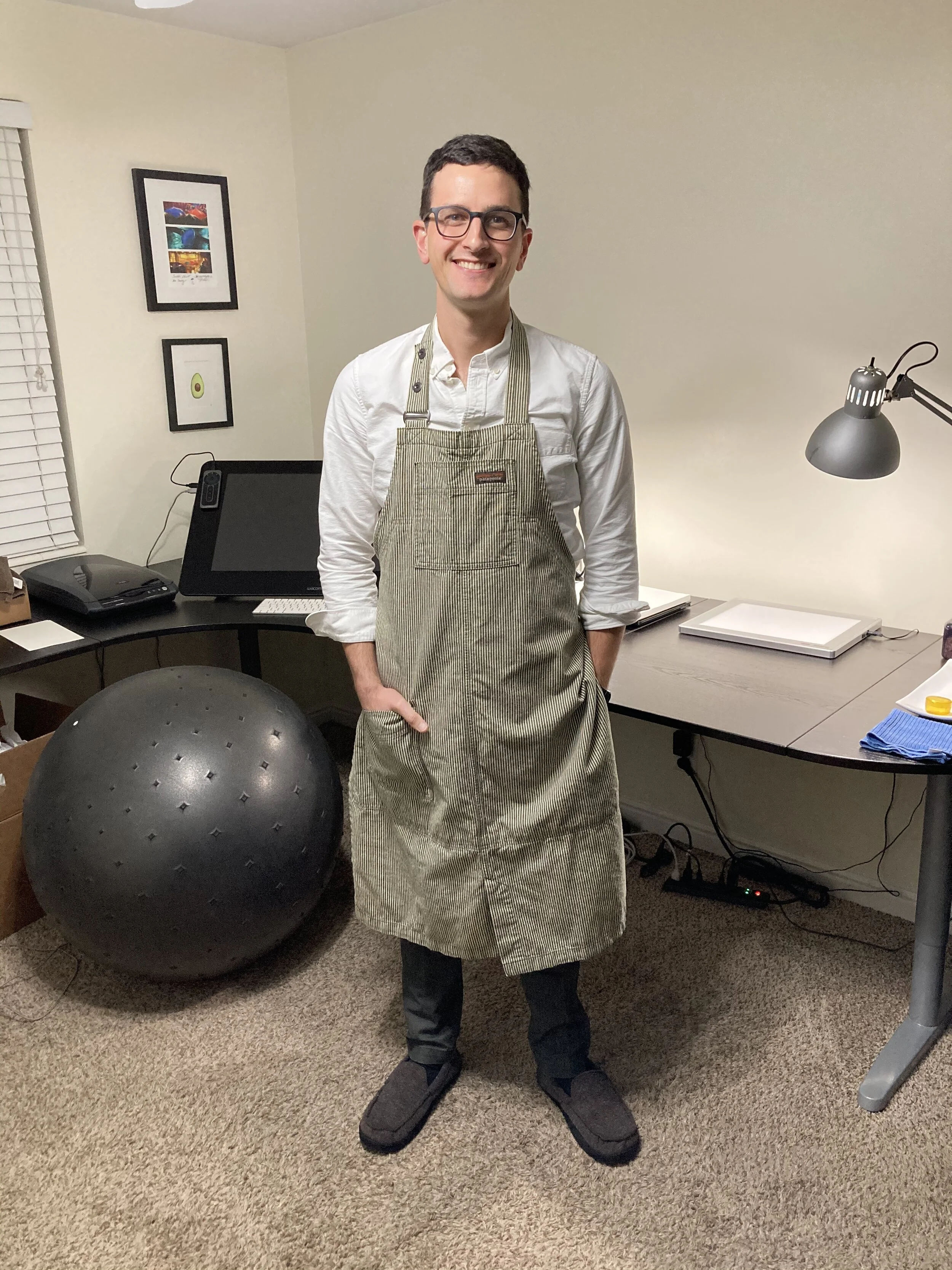 This year, I got a work apron for Christmas. I’ve always loved the idea (passed on to me by Dr. Seuss and Mr. Rogers) of changing outfits when moving into the creative zone. A couple of years ago, I saw a documentary about Miyazaki where he wore a simple apron to keep clean while working. I’ve copied him. So far, the apron’s been awesome. It helps me focus on what I’m in the studio to do, it helps my family know when I’m “in the zone”, and I have to say, it looks pretty great. Thanks, Janae!